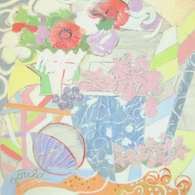 Still Life with Blue Cloth and Purple Fan, 30×30In private collection